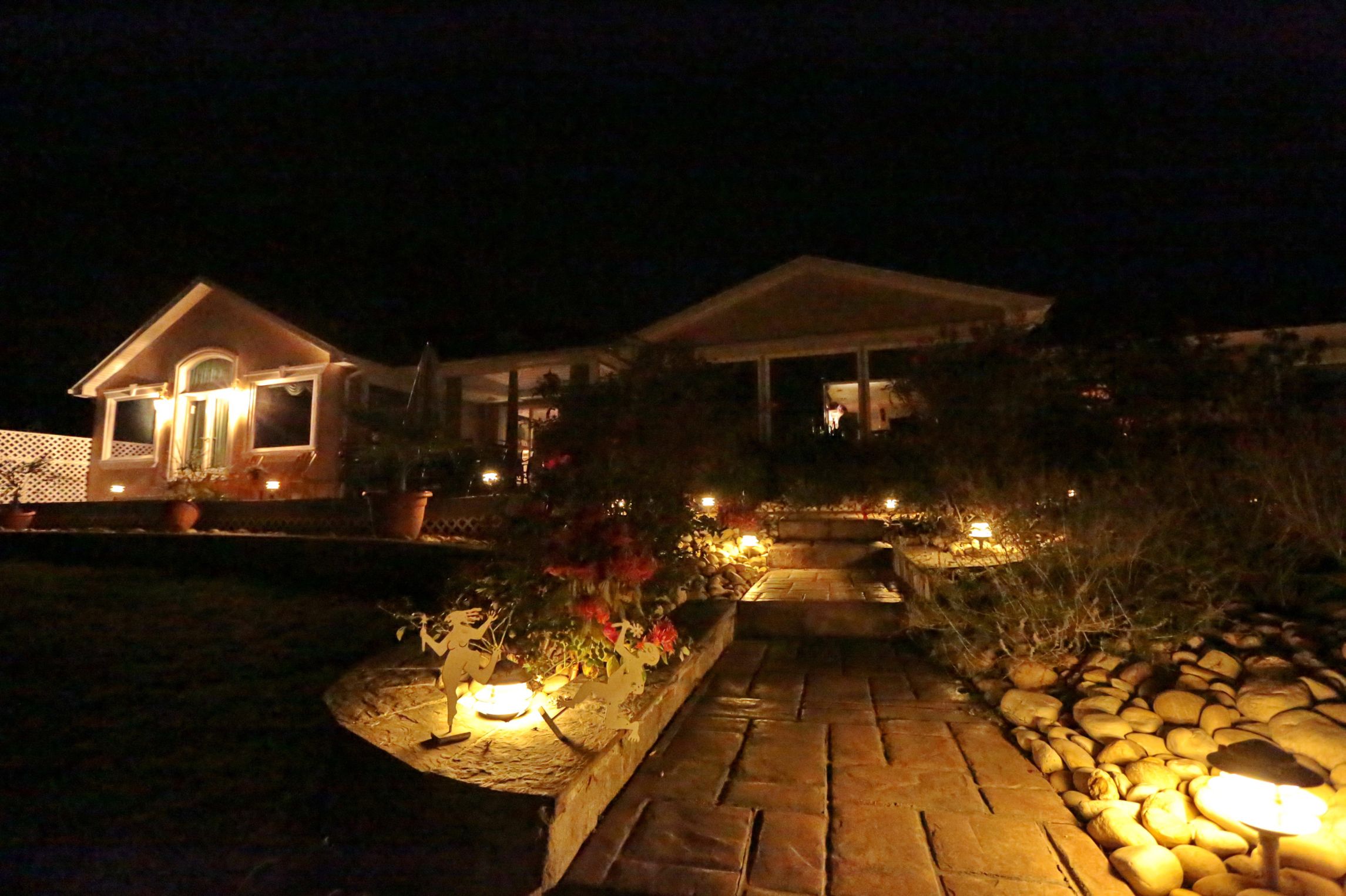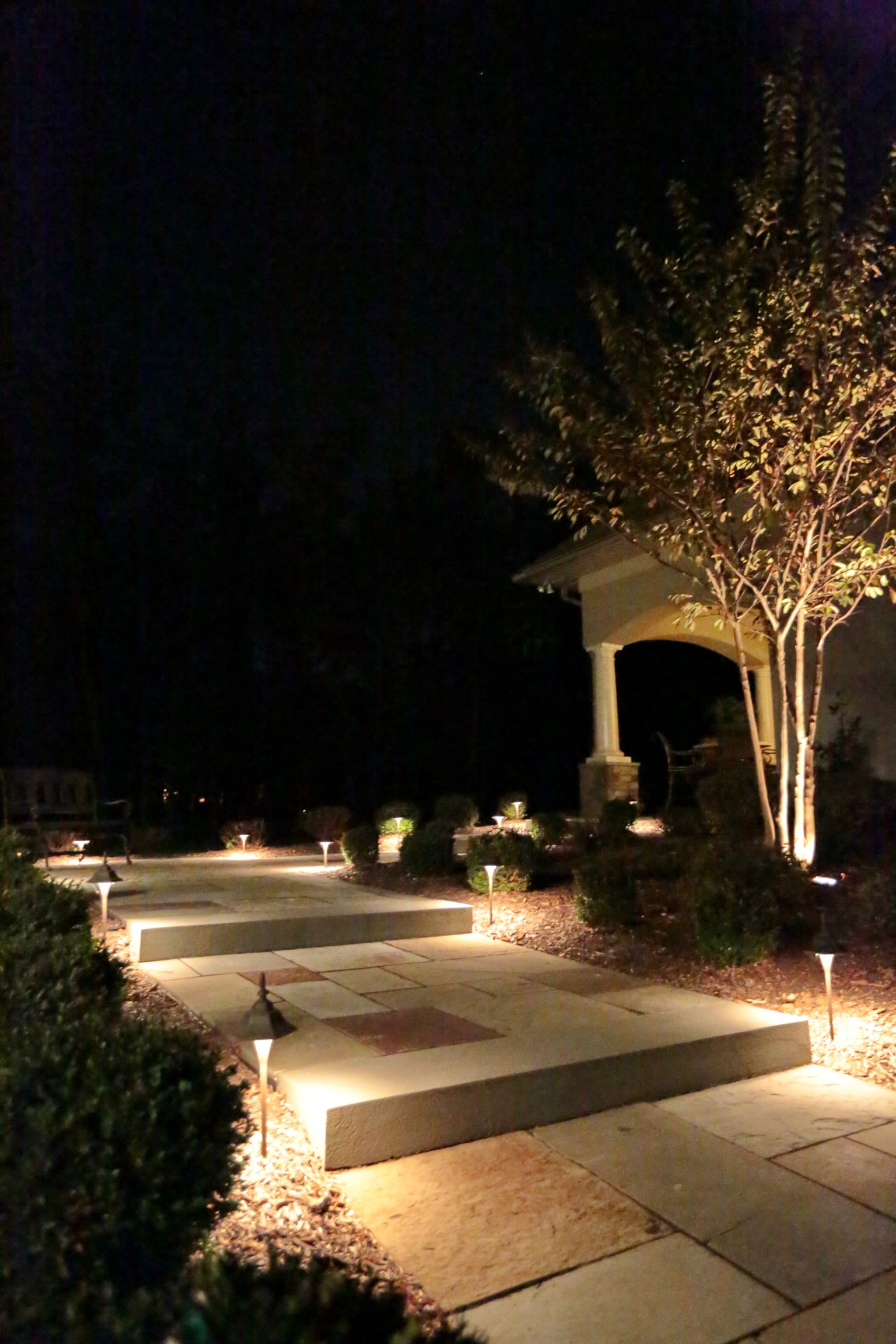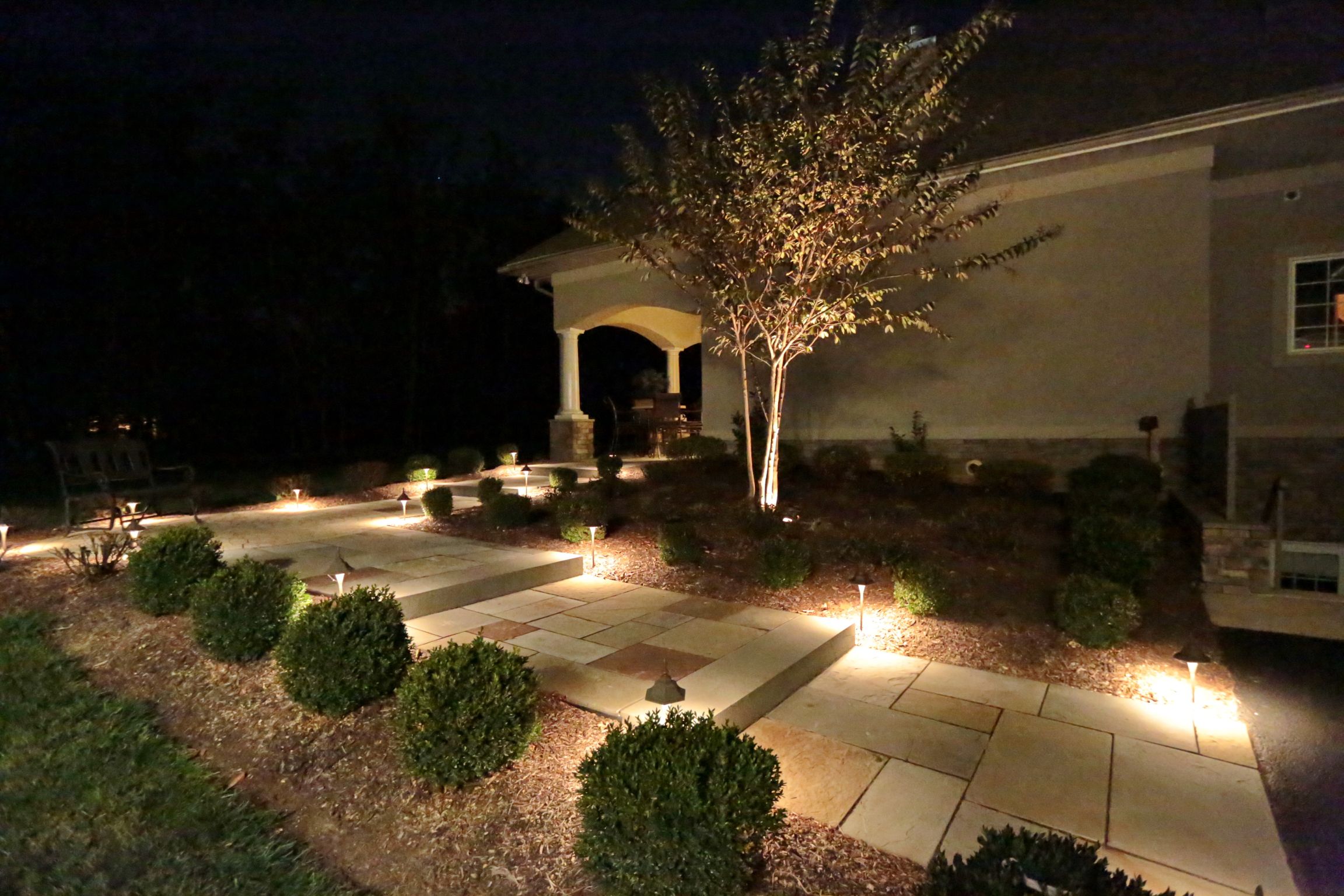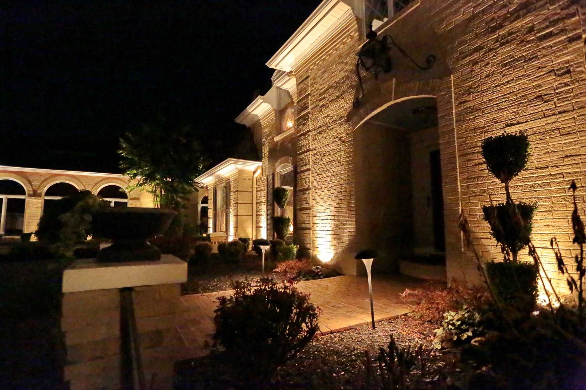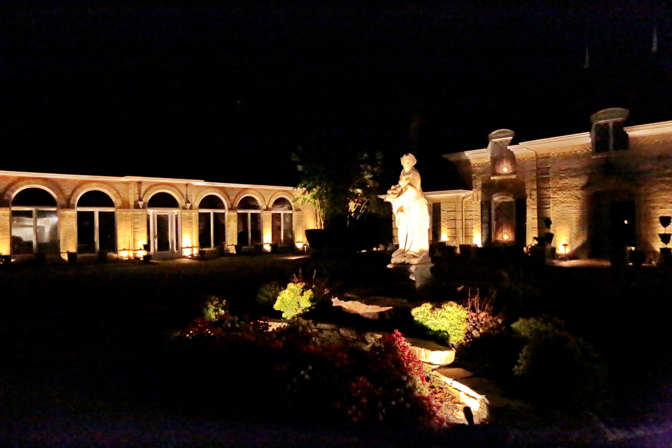 Beauty - Low voltage lighting accentuates the shapes and textures of a landscape and its structures. Lighting designers not only paint pictures with light, they create dramatic scenes that give the viewer a dynamic experience of the property.
